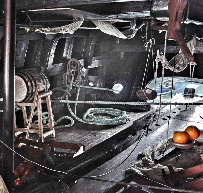 When I entered the captain’s cabin, it was in complete darkness. I let my eyes adjust, but it remained very difficult to see the far side. The cabin had no lights, and every surface was painted black.