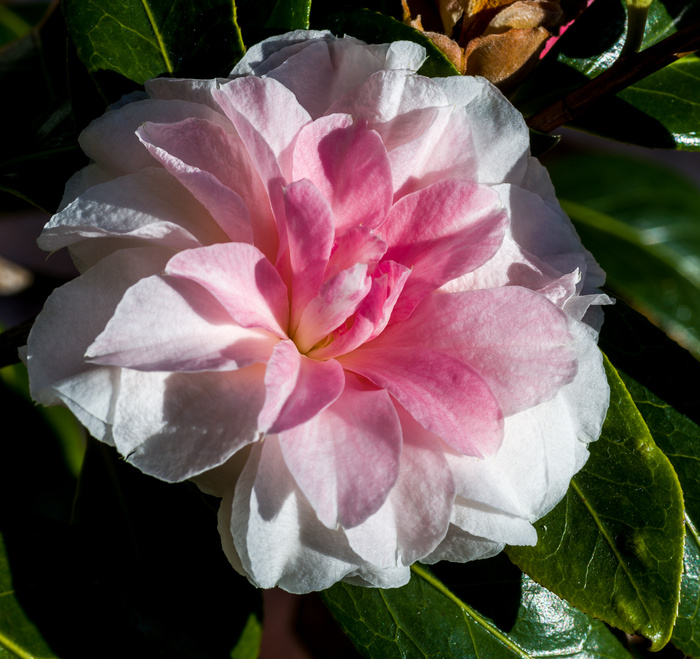 A camellia adds such a variety of subtle colours that I hope the single bloom displays.