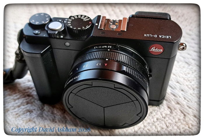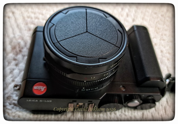 Leica D-Lux Typ.109 with lens extended ready for shooting. Note the essential accessory, a self-operating lens cap, which I consider to be better than a lens cap attached to the camera by a cord.